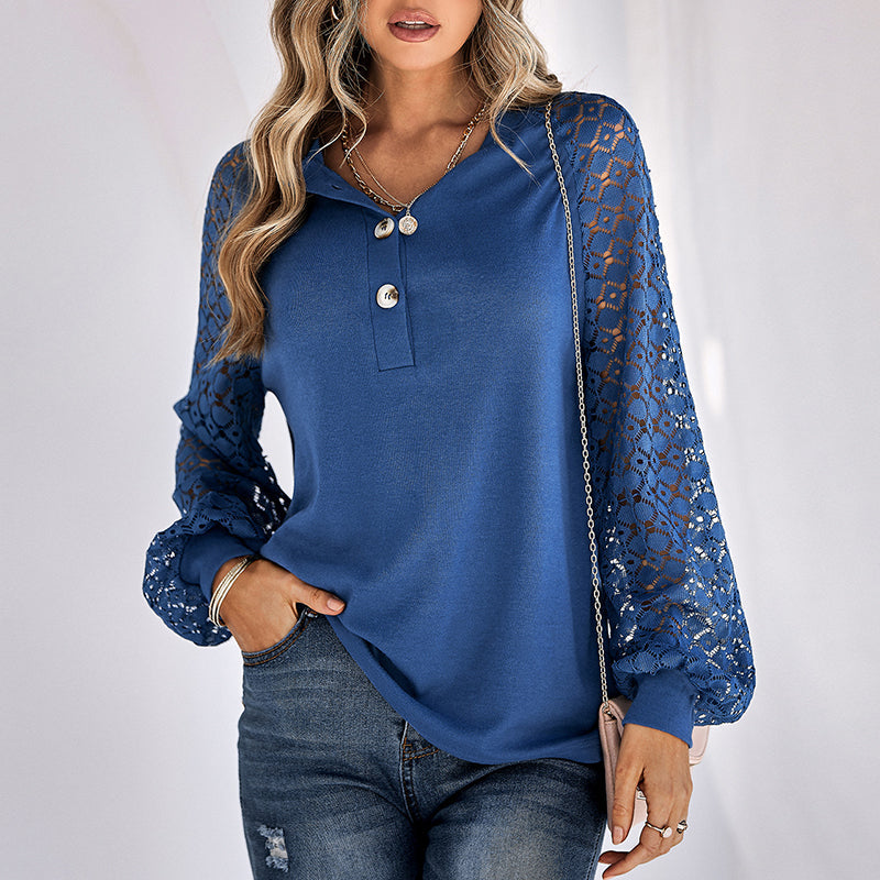 • Features: Knitted cut-out sleeve top, classic rounded v-neckline, long sleeve, button, dropped shoulder, solid color.
