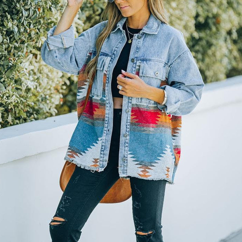 Material: Cotton and Polyester. Women's Aztec jacket with button closure and breast pockets.