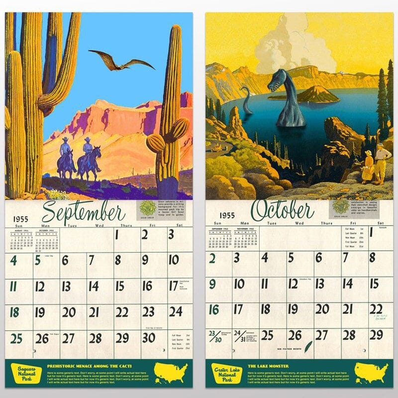 šĀ DESIGN: Real National Parks; Fake Monsters! Itās the 2023 Alternate Histories Calendar, packed with monsters, aliens, zombies, and other creatures rampaging through Americaās National Parks.