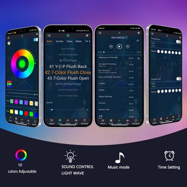 Music and Mic Sync Mode: The special design by adding IC in the LED strip lights,showing different colors display simultaneously in a line. After connecting your smart phone via Bluetooth, the light strip color not only dance with rhythm of music while you play music on your phone, but also the light will auto change when MIC capture ambient sounds You can sync to music and enables you to enjoy the fun with the color changing following the music rhythm or your voice.