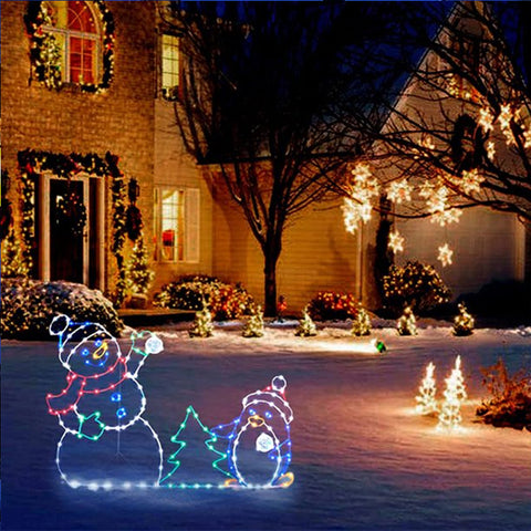 • -- This brightly lit snowman and penguin will have endless snowball fights. To provide passers-by with an animated illusion of two friends throwing snowballs back and forth. The frame is outlined with colored lights, showing a standard snowman wearing a red scarf and carrot nose, a chunky penguin wearing a Christmas hat, and Evergreen trees between them.