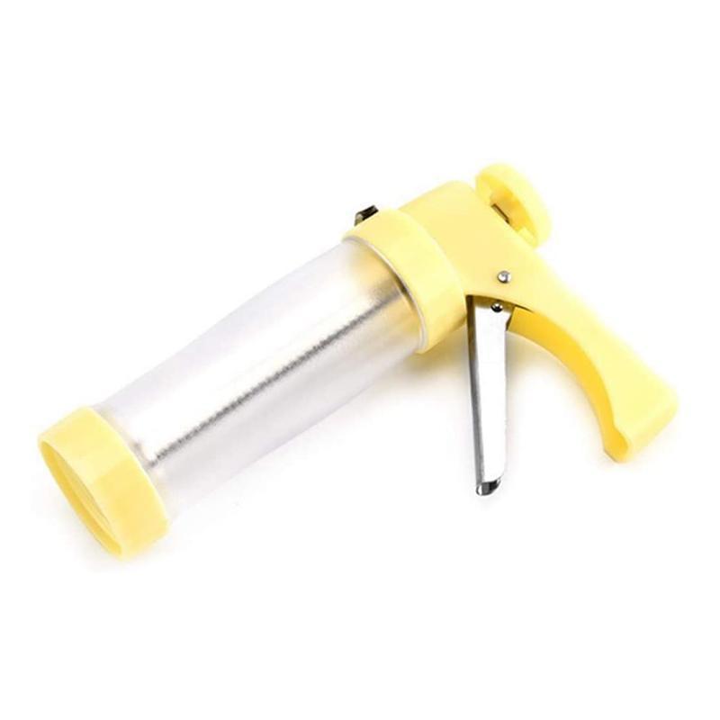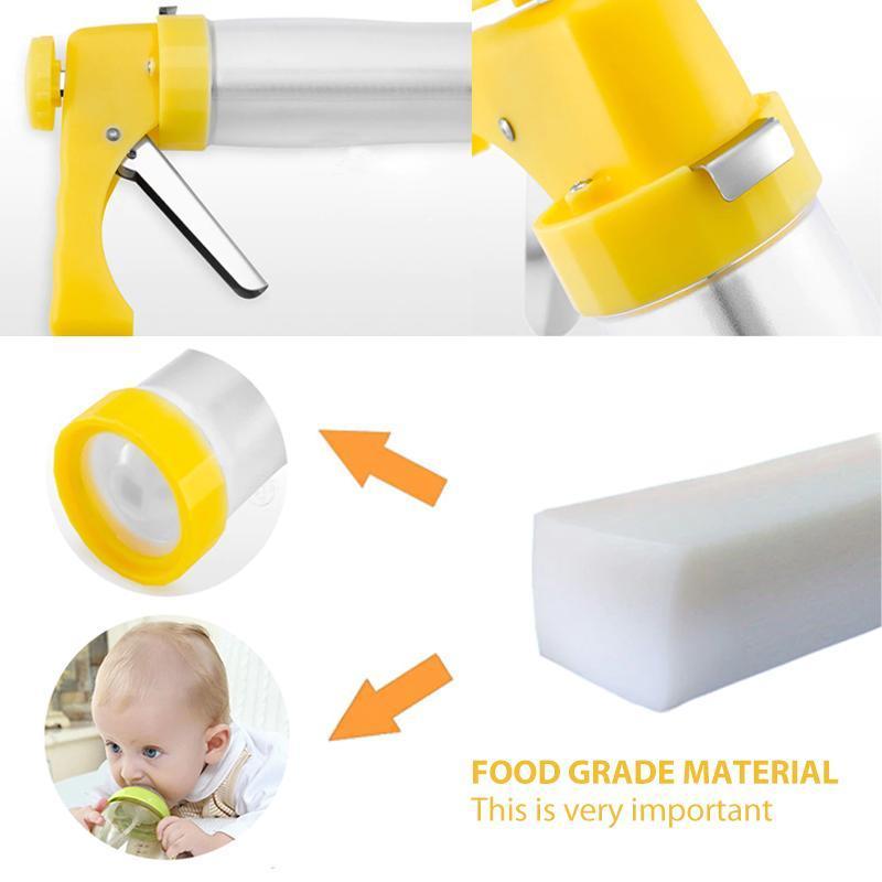 - Complete Cookie Press Set for Cookies and Biscuits – This cookie press set is a good gift for Christmas and New Year.It will comes with 1 Cookies Press Gun, 2 PCS Macaroon Silicone Baking Mat Sheets, 16 pcs Decorative Stencil Discs and 6 Icing Tips, 2 Cleaning Brush and 100ml Measuring cup, a complete set for your to make cookies and biscuits.