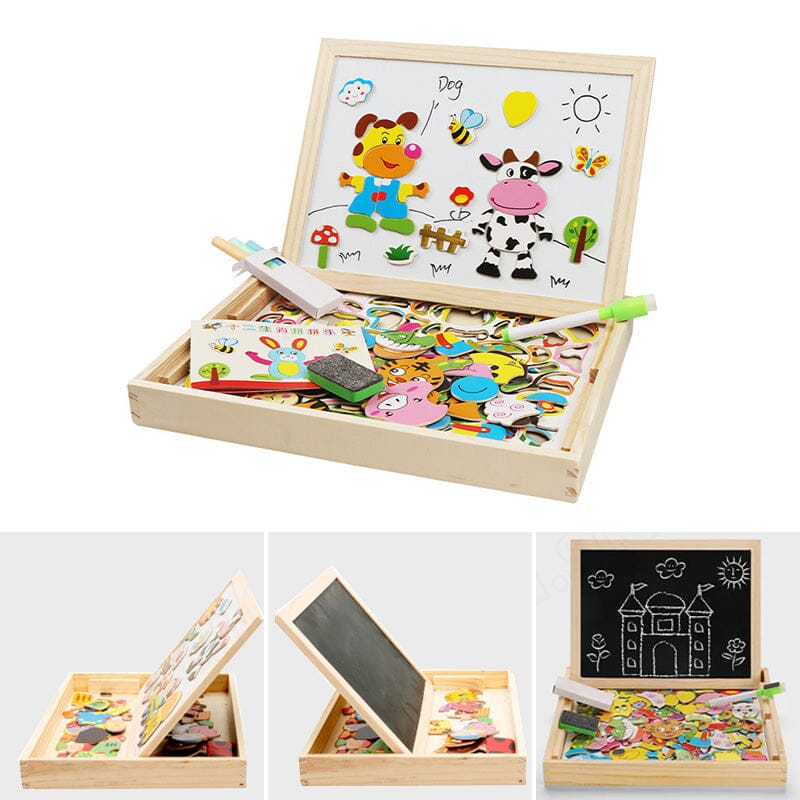 Double sided art board, both white dry erase and black chalk board. Over 100 colorful different animals themed wooden pieces with full magnetic backing